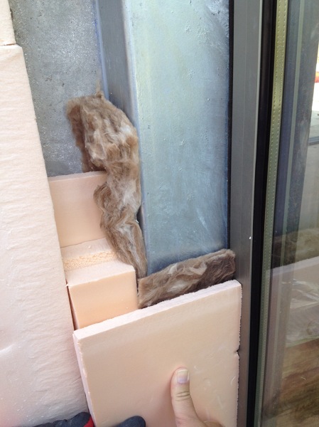 Le adjunto una foto del detalle de una obra que estoy haciendo ahora mismo y verá que ademas del aislante (e=10cm) de la fachada ventilada, existe la junta estanca entre obra-premarco y entre remarco-marco y que no sólo protegemos las juntas sino que la carpintería de aluminio con rotura de puente térmico (que es de alta gama de Technal) también está protegida por el aislante.