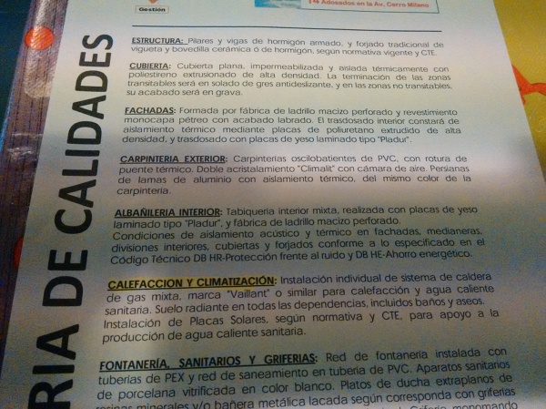 Para ir concluyendo… me preocupa y me imponte mucho respeto (por no buscar otra expresión que pudiera herir sensibilidades) que una empresa promotora / constructora o quien sea que edita la memoria de calidades, no tenga un poquito de cuidado en ese documento que hoy en día, cualquiera (como usted) hace visible en internet y a mí, hay cosas que veo que me chirrían. Que se hable de temas de FACHADA sobre las condiciones de aislamiento térmico y acústico en el punto de TABIQUERÍA INTERIOR, cuanto menos, chirría… parece que es cuestión de llenar espacio.