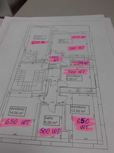 Quiero cambiar los radiadores convencionales por unos de baja temperatura, que serían alimentados por aerotermia. Me han pasado la imagen que adjunto con los metros cuadrados aproximados por estancia y la potencia de los radiadores de baja temperatura que se instalarían. A mi me parece que no está bien calculado, sobre todo en alguna estancia me parece muy poca potencia para el espacio a calentar.