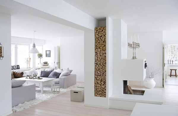 Por lo que se ve en la imagen, el salón está dividido en dos grandes zonas, una a la izquierda con sofás y otra a la derecha de la que solo se ve la chimenea y la carga de leña que además, me parece muy original, aunque no veo cómodo su uso. A la derecha y en segundo plano se observa parcialmente lo que pudiera ser la cocina o un office y teniendo en cuenta que también en segundo plano se observa a la izquierda al menos una puerta, yo diría que esa puerta lleva a un espacio de recibidor de la vivienda para acceder al salón y a la derecha está la cocina con acceso desde la zona de chimenea y desde el recibidor, pero esto, ya son meras especulaciones.