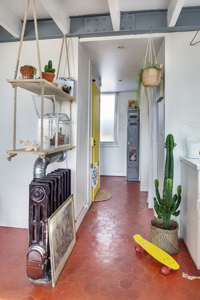 Hola, si se refiere a los estantes decorativos que cuelgan del techo son de madera de pino.flandes en color crudo. Un saludo