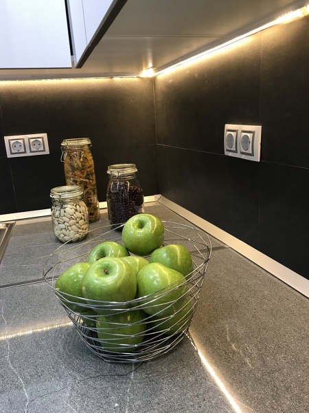 en una de las paredes, pones todos los electrodomesticos, asi la medida sera igual en todo el paño.