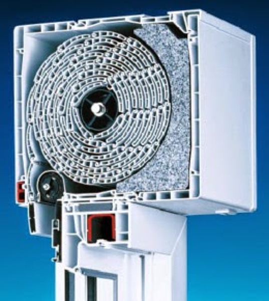 Si la carpintería (ventana) es relativamente nueva (y puede serlo al mencionar el tema del sistema de ventilación), veo probable que el cajón de la persiana tenga aislamiento interior con la forma cóncava de la persiana, de modo que la filtración de agua se produce por la parte superior del cajón, pero cuando la persiana está subida, el cajón está "lleno" de persiana (fotografía adjunta) y la persiana sea la que tapone el punto de entrada, pero cuando baja usted la persiana deja el paso libre a la entrada de agua.
