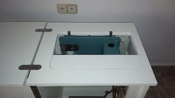 Casi todos estos muebles tienen el mismo sistema. La máquina de coser esta anclada a la parte abatible que gira hacia abajo (tal como está ahora) y para poder ponerse a coser, lo que hay que hacer es bajar la parte superior que está ahora mismo cerrada en la fotografía, esa "media base" se baja también hacia abajo, se sube la parte que tiene la máquina anclada y acto seguido se sube la otra "media base" que tiene un rebaje en la línea que coincide con la base dónde está la máquina, de modo que ese rebaje y un sistema de clic mecánico que suelta y fija esta media base o un rebaje perimetral, es lo que acaba sosteniendo la base de la máquina.