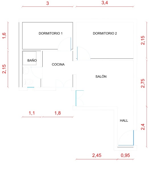 Buenos días Francisco, pensando rápidamente una opción puede ser girar el baño manteniendo la bajante y así darle más espacio al dormitorio 1. De esta forma te podría quedar un dormitorio de 2,2*3m y un baño de 2'90*1,55 m. Para darle luz a ese dormitorio puedes separarlo del baño con una fábrica de pavés traslucido. La cocina americana en los 2,45 m junto a la ventana y resto diáfano. Puede quedar muy bonito.