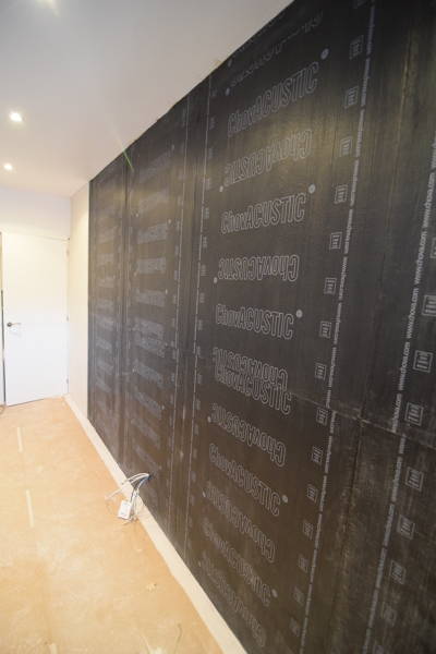 La solución es una doble pared sellada en su perímetro, con relleno interior de aislantes+absorbentes y acabado final de pladur de varias capas+lámina viscolam de tela asfáltica. Grosor total 10cm aprox.