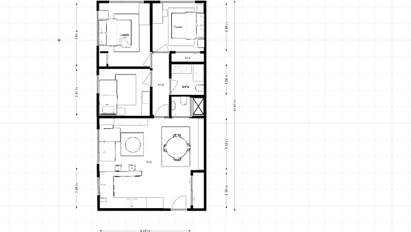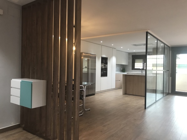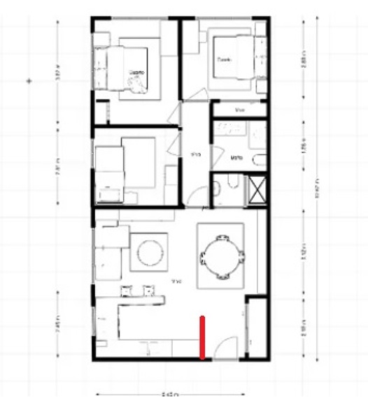 La cocina y el salón en la actualidad están separados por una pared. quiero tirarla y unirlos ero me encuentro con que la entrada es directa a la estancia y pierdo el espacio del recibidor. ¿cómo disponer la cocina y cómo no perder el recibidor? La foto muestra cómo quedaría el plano al tirar el muro separados?