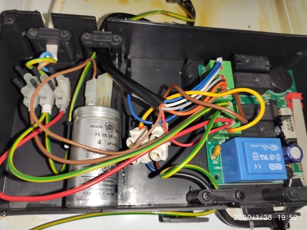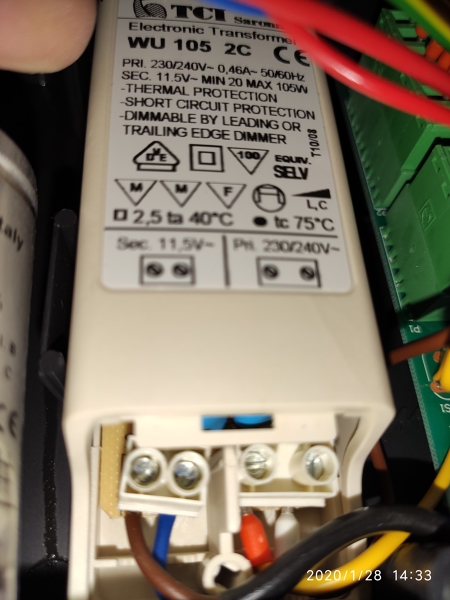 Los cables azul y marrón que salen del trafo van a 12v son los que alimentan las 4 lámparas halogenas. El cable amarillo y el que esta detrás que se ve poco pero es de color marrón que entran por el otro extremo del trafo, que voltaje llevaran?