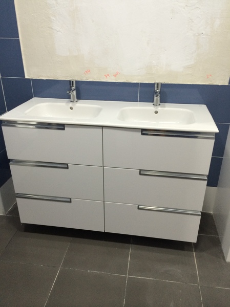 Parece que es un mueble de 121x46 compuesto de dos módulos de 60x45 de tres cajones con tirador uñero y zócalo o patas + Lavabo de dos senos de 121x46.