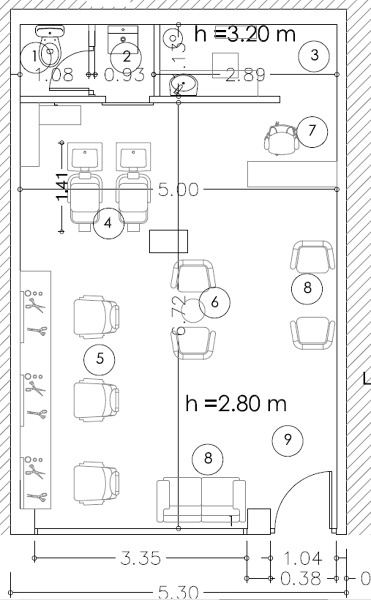 Te aconsejo igualmente que cuentes con un profesional que te asesore porque, aunque el local es pequeño, se puede hacer una distribucion que cumpla con el programa minimo de peluqueria. Te adjunto una foto de la distribucion en aquel caso para que te sirva de orientacion.