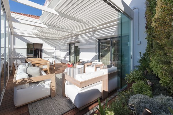 por la foto puede ser parecida a una que vi intalada, los laterales se cierran con cristal y el techo las lamas ajustan para que no pase el agua y hacen de paraguas a una canal en el lateral