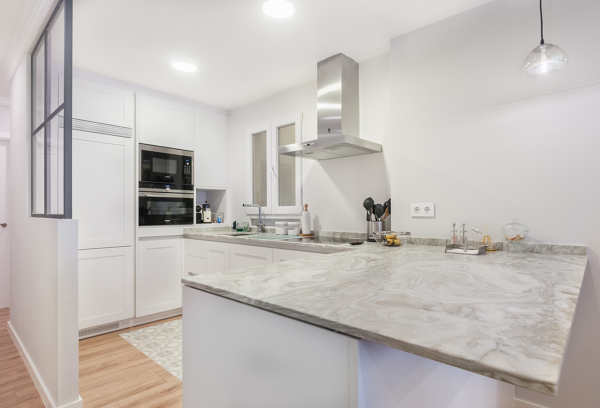 Por estética y a la vista de las fotografías, parece mármol, aunque no es lo más conveniente para una encimera de cocina; también se puede tratar de material sintético imitación mármol.