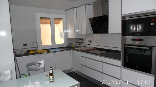 Creo además que al llevar la encimera negra puedes poner la vitro o gas de cristal blanco y fregadero blanco de resina y se y combinara con el color blanco del DM lacado.