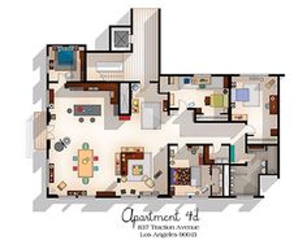 Hace algún tiempo, no recuerdo bien dónde, vi un reportaje en el que "se imaginaban"como serían las viviendas de determinadas series, pero no se trataba de planos de viviendas reales, era una suposición... lo que indica la compañera es cierto, por lo general, este tipo de series y comedias de situación en viviendas, realmente son varios decorados de las distintas estancias... si se fija un poco, los planos en las series son siempre los mismos, el salón se ve siempre desde el mismo ángulo, lo mismo con pasillos, dormitorios, etc... al otro lado, lo que no se vería desde el punto de vista de la cámara es "el más absoluto vacío", o sea... un estudio de rodaje.