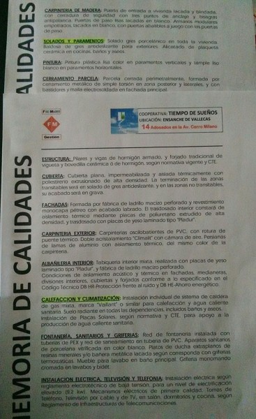 Recuerdo que ya le hice muchisimos comentarios sobre esta memoria de calidades concreta y, hay mucho que se puede mejorar... critique "el pvc con rotura de puente termico", la nula definicion y compromiso en marcas, espesores de aislamientos, etc...