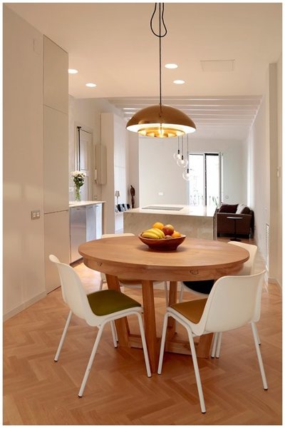 Por la proporción de las sillas, parece de 80 ó 90 de diámetro, debajo del tablero se ven dos encastres por lo que aparentemente sí es extensible.
