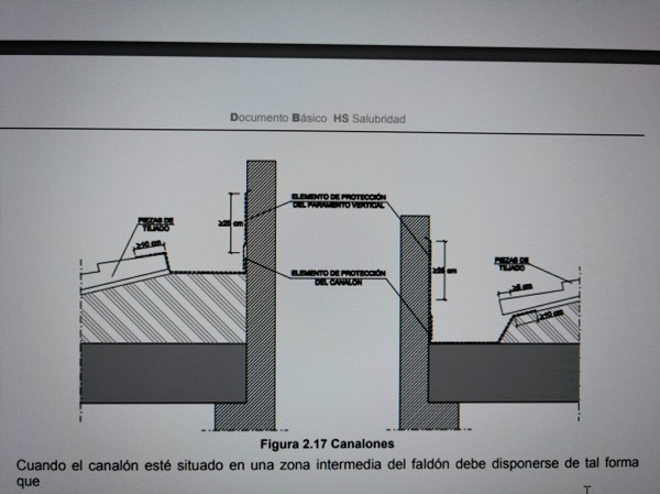 En cuanto a las Normas del CTE en la sección HS, también hay normas que en contra de esta solución constructiva. Le adjunto copia de una figura de dicho CTE donde pone el modo de proceder en estos casos. Por no cumplir estás Normas tuve graves filtraciones en el tejado de la planta baja.