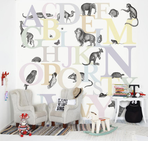 el precio corresponde a un mural de 270 centímetros x 265 centímetros Mural de papel pintado con abecedario de animales en colores pastel