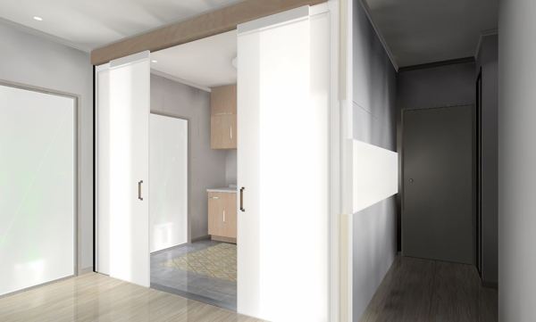 Pero son dos espacios de uso diferenciados y que no siempre te va a apetecer tener la cocina a la vista de cualquier persona que llegue a casa por diferentes motivos ( no siempre van a ser familia o amigos), por lo que te sugeriría una solución mixta. Además, si zonificamos bien, la sensación de amplitud es mayor. Quiero decir definir bien diferentes ambientes aunque estén dentro del mismo espacio. Depende de tus preferencias de estilo para decorar, pero unas puertas correderas en vidrio opal para separar cocina y salón que podrás mantener abiertas o cerradas y que dejarán pasar luz en ambos casos, y no te obligan a rehacer falsos techos. Eliminar la puertas de salón y cocina del recibidor pero manteniendo la pared divisoria de éste con la cocina y ajustándo su medida a la que nos manden los muebles de cocina para poder optimizar el uso de esa pared para alojar muebles de cocina.