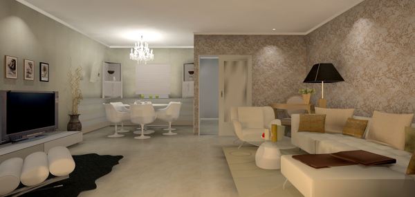 Hola viajera, nuestra propuesta es facilitar el tránsito desde la entrada hasta los diferentes ambientes; salón y comedor y no obstaculizar la vista hacia la terraza, es un error tapar la amplitud de vistas colocando sofás delante de la salida a la terraza o patio que tienes. Proponemos por tanto llevar los sofás a la pared y como lo normal es que pongas una televión de mas de 40 pulgadas... tienes distancia cómoda para verla desde el sofá o los sillones. Una mesa circular u ovalada sería una opción cómoda para la zona de comedor y si tus necesidades son para seis asientos una mesa con pié central también es mas cómoda para los comensales. Proponemos sillas y mesa del tipo tulip, si te decidieras por una decoración mas moderna.