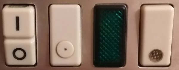 Serie Magic de Ticino, de izquierda a derecha 1-interruptor automatico magnetotermico (a modo de fusible), 2-pulsador (seguramente timbre de habitaciones), 3-piloto luminoso (ni idea), 4-interruptor (seguramente para la luz). Antiguamente se hacian muchas cosas raras.