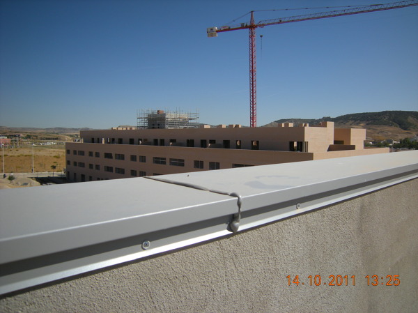 En el grueso interior del pliegue de la albardilla se colocaba una tira de poliestireno extrusionado de alta densidad, pegado al perfil, pera evitar el repiqueteo en caso de lluvia y se sellaban las uniones con abundante masilla de poliruretano que se limpiaba una vez expandida.