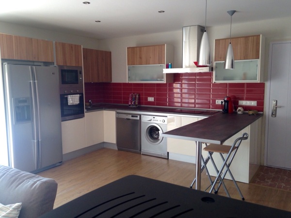 Son azulejos biselados de 30x10, muy fáciles de limpiar y se pegaron a la pared una vez finalizada la cocina. En blanco brillo también dan un muy buen resultado, y si cogieras unas baldosas mas blancas satinadas quizás las salpicaduras se verían más.