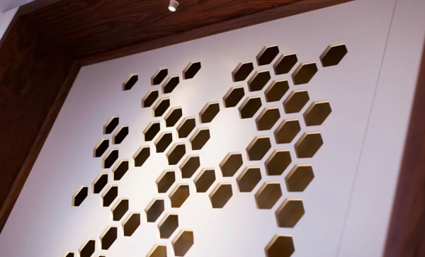 Si accede al proyecto del que ha sacado la fotografía, encontrará imágenes de toda la vivienda reformada y encontrará la que le adjunto... dónde puede ver que hay relieve, parece un tablero o un composite con los hexágonos troquelados.