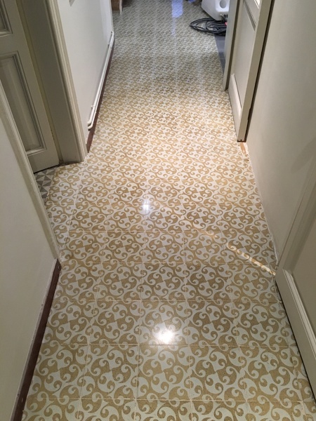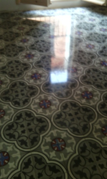 El suelo hidráulico se puede abrillantar como el terrazo o el mármol aunque el brillo final no es el mismo. Si el suelo está muy dañado deberías realizar un pulido para reparar grietas y eliminar manchas. Con el abrillantado solo eliminarás las manchas superficiales y es posible que queden las sombras de la mancha.