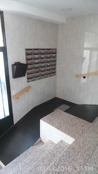 Le adjunto dos fotos de una rampa interior de un portal idéntico al caso que acabo de comentarle. Esa rampa no cumple normativa alguna... es lo mejor que le ofrecieron a la persona que la necesitaba el resto de vecinos y por otro lado, está claro que con total ausencia de técnico que les valorase que podían o no podían hacer.