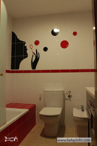 Sin embargo, si las baldosas están en la pared, la pintura puede ser una buena solución, por económica, y por versátil. Te adjunto un ejemplo en un cuarto de baño que decoramos nosotros, y que quedó así de bonito.