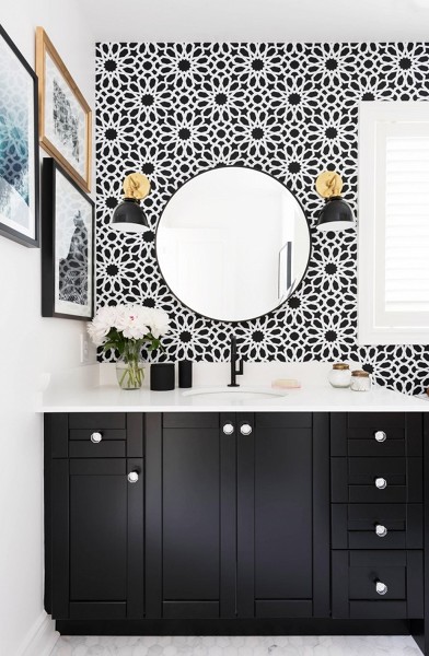 El mueble es un lacado negro mate y la pared parece ser un vinilo