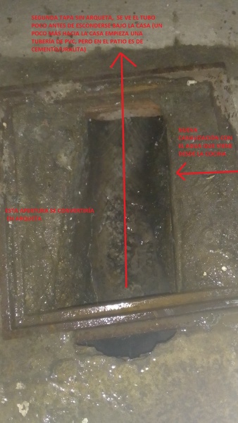 Y en la segunda apertura simplemente se ve la tubería/conducto de cemento. Sería cambiar esa tubería por algo menos rugoso y en ese tramo unir la tubería que viene de la cocina, para ver si no hace el efecto de llevarlo hacia atrás que hay ahora en la arqueta. En ese tramo no hay arqueta cuadrada, solo apertura. Y ahí iría otra arqueta con sifón que se pueda abrir para comprobar atascos , que no salga olor y que pueda entrar el agua de lluvia que sale por el canalón que se ve ahí + por el tejadillo en mal estado(cae agua por todo el patio)-