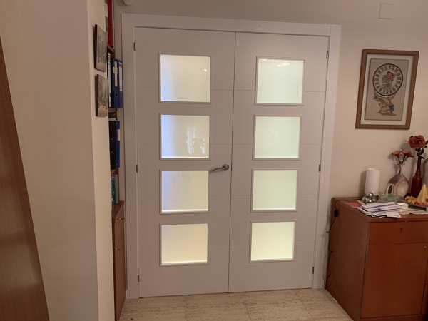 - Puede Vd. adquirir la puerta en centro de bricolage, tipo Leroy Merlin. 650€ iva incluido con tapetas extensibles. (Puerta doble asimétrica con vidriera 72.5+42.5)