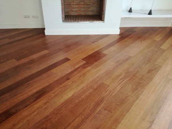 acuchillado de parquet con maquina de rodillo y banda con lija del 36, haciendose los bordes con una orillera que lleva lija de discos tambien del mismo numero. Despues se le pasaria una lija del 80 que es un grano inferior para ir suvizandolo y por ultima una tercera vez con una lija de 120. Tras esto se le aplica la primera capa de barniz, las marcas mas convencionales serian deva, lisolen o yeles.