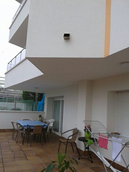 El año concreto no lo sé, pero es de la década de los 80, está en Vilassar de Mar, población de Barcelona. Y confirmo que la terraza es de uso privado según consta en la escritura.