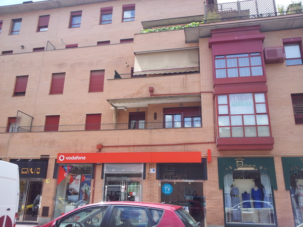 Lo que tendrían que hacer es algo parecido a lo que le muestro en la siguiente foto (aunque espero que mejor hecho), como verá, hay unas cazoletas en el centro de las terrazas que recogen aguas y se conducen lateralmente para bajar por el lateral de la tienda Vodafone... y verter a la acera (algo que tampoco está permitido, pero mejor eso que el chorro desde seis metros de altura).