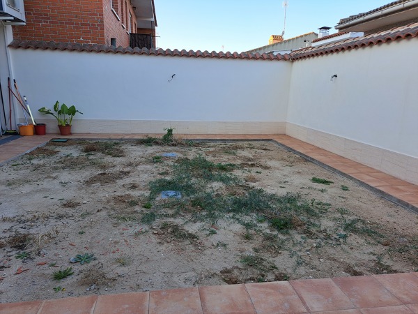 Hola, el terreno tiene inclinación hacia el vecino y ahora que ha llovido se ven las zonas donde va el agua. Ellos dicen que lo primero es poner canalones a ver si soluciona algo y que ponga césped artificial en lugar de natural y plantas en jardineras en lugar de la tierra.