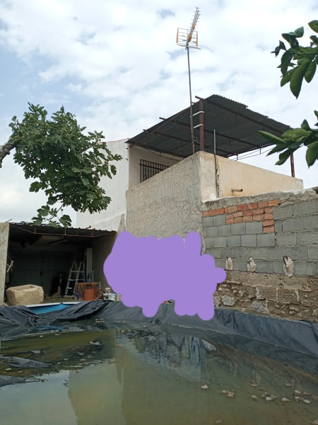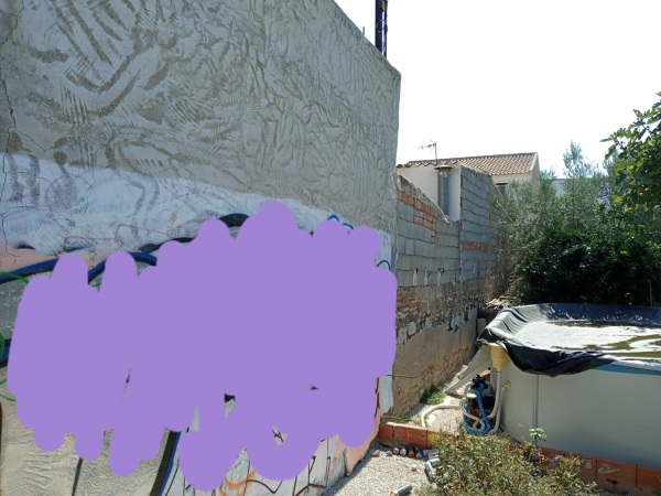 Buenos dias,en esta foto se ve algo mejor,el terreno que se ve es uno de mis patios,parece que el vecino en su día levanto la pared medianera para hacer su casa,lo que sale tapado en la pared solo son unas pintadas
