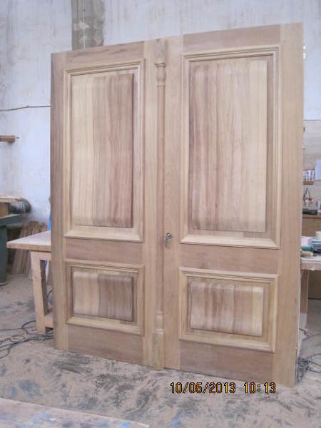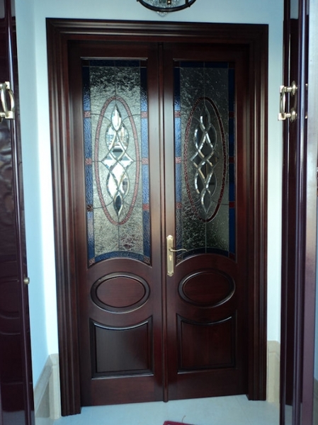 Hola, la puerta es de madera de iroko, teñida y barnizada en color oscuro. Herraje dorado y cerradura con llave. El precio es de 1728 € con la toma de medidas y la instalacion incluída.