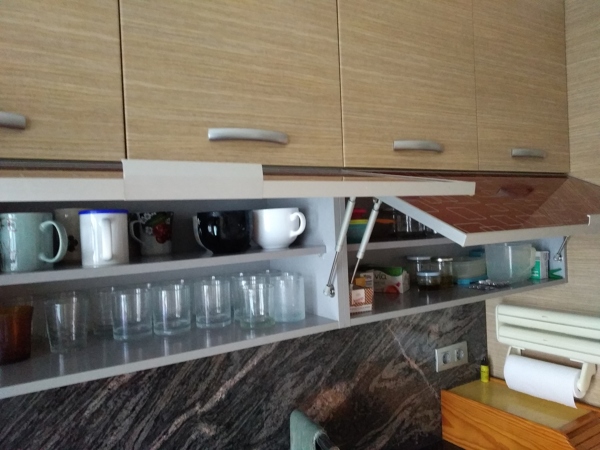 Se trata de un altillo de un armario de cocina (ver foto) que ahora tiene puertas abatibles y suponen un peligro de golpe en la cabeza cuando estan abiertas. La pregunta es si se puede poner unas puertas correderas de cristal ya sea traslucido, de colores o de dibujos para evitar el peligro de golpearse en la cabeza cuando estas cocinando.