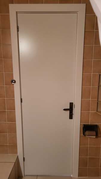 Otra cosa el el grosor del block... En baños se utilizan grosores mayores por el recrecido del azulejo de pared, lo que se denomina galce (galce 9, 12...) Mejor adquirir block de galce mayor para evitar una tapeta de ala tan larga. Pero esto no siempre es posible. Primero porque no toda las familias de puertas tienen galces variados, y segundo porque si el premarco es de 7cm, el galce debe ser de 7 para agarre de bisagras y la tapeta ala 40 para cubrir hasta el azulejo. Eso estaría bien hecho.
