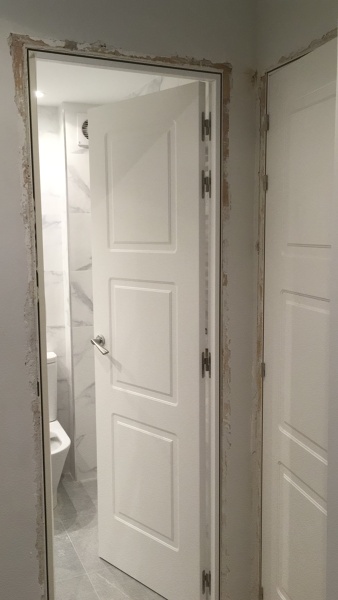 • El marco (jamba) todavía no está terminado: falta la tapa/embellecedor o moldura que cubre el hueco entre la pared y el marco.
