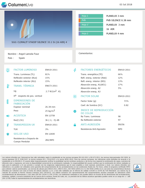 Te dejo la ficha tecnica de una composicion bastante buena para el aislamiento acustico que ademas no supone mucho peso para la ventana.
