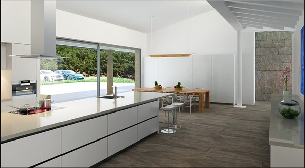 Nadie le va a poder responder a sus cuestiones, pues no se trata de una imagen real de una vivienda real, le podría indicar que a lo mejor el autor del proyecto le podría responder, pero tampoco... es una infografia 3D. No hay más que repasar con algo de atención las imágenes de dicho proyecto y además de comprobar que tienen una perspectiva propia de grandes angulares o, precisamente de representaciones 3D, si se mira con un poco de atención los detalles de algunas fotos, hay texturas que no son del todo reales... y a mí personalmente me lo indica la unión de los pilares metálicos con el solado, el punto de apoyo superior de la columna exterior de la foto que adjunto, la textura de la mesa, etc...