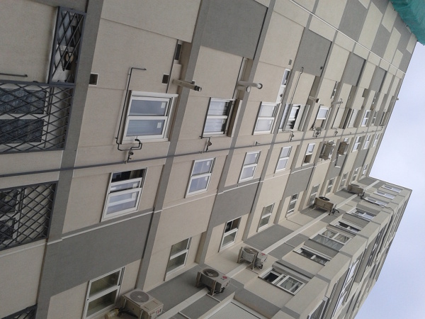 Todo parece indicar que la fachada de la foto ha sido remodelada, reformada y rehabilitada con un SATE (sistema de aislamiento térmico exterior), no se trata de obra nueva, la diferente alineación y disposición de equipos exteriores de aire, en unas viviendas y en otras no... diferente posición de salidas de humos de calderas, rejillas de ventilación, acometidas de gas, etc...
