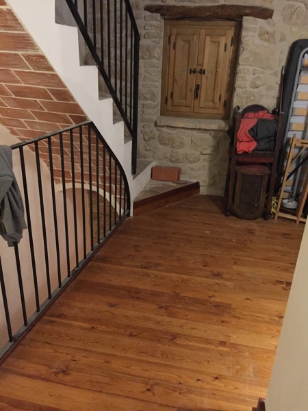 Adjunto foto de suelo de tarima con peldaño color nogal barnizado mate.