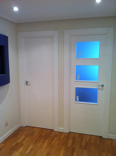 Hola Belen, indicamos como puerta moderna y elegante la lacada blanca con 4 líneas horizontales y el precio sería con el iva incluído. Se incluiría el herraje color aluminio, las tapetas de 7 cm. ancho y la instalación, en la cual no sería necesario cambiar el marco antiguo, pues lo forraríamos con nuevos galces.