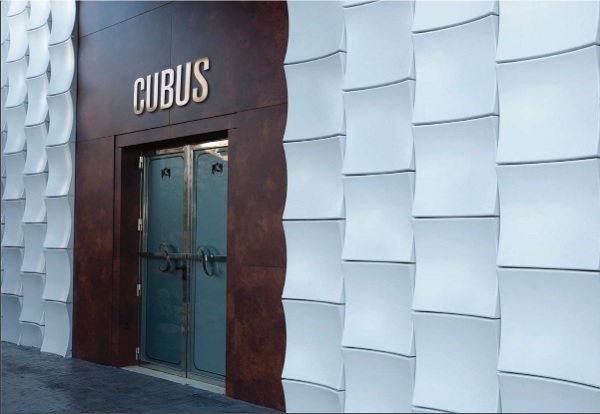 Pudiera ser un revestimiento cerámico, incluso a lo mejor un prefabricado específico para fachadas ventiladas en edificios singulares (cerámico, composite, etc), pero la verdad es que a bote pronto, no lo identifico.
