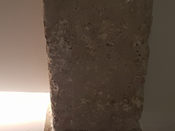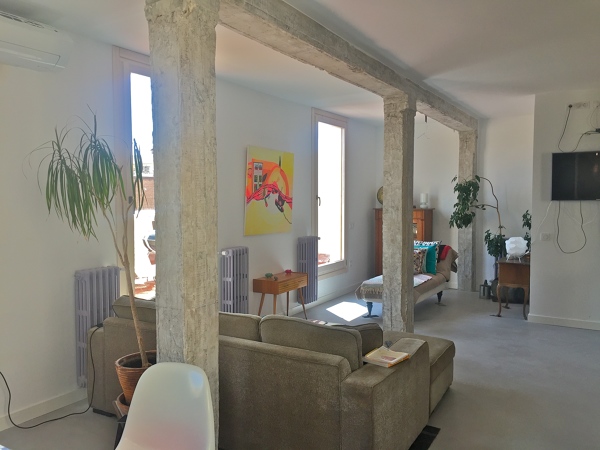 lo que hicimos en esta obra fue, una vez demolido el trasdosado de ladrillo que envolvía la estructura, simplemente limpiar las superficies de hormigón mediante cepillo giratorio acoplado a una radial. En muchas zonas no aplicamos tratamiento alguno, puesto que el cliente gustaba del aspecto que quedaba. El resultado es espectacular.